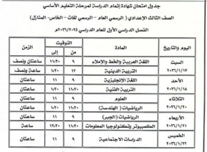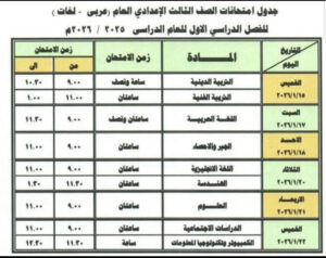 ننشر لكم جدول امتحانات الشهادة الاعدادية الترم الأول 2026 في جميع المحافظات، حيث تستكمل امتحانات الصف الثالث الإعدادي اليوم السبت، بأداء امتحان اللغة العربية في أغلب المحافظات، حيث يتجه مئات ألاف الطلاب إلى اللجان صباح اليوم لبداية اللجنة الأولى التي تبدأ في الساعة التاسعة صباحاً وسط إجراءات آمنية مشددة، ومجموعة من الضوابط التنظيمية التي اقرتها وزارة التربية والتعليم لضمان سير العملية الامتحانية في ظروف هادئة، ومن خلال هذا المقال نكشف عن جداول امتحانات ثالثة إعدادي كاملة بالمواعيد.