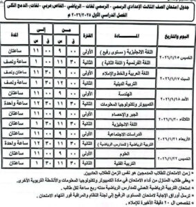 جدول الصف الثالث الإعدادي الترم الأول 2026 محافظة بنى سويف