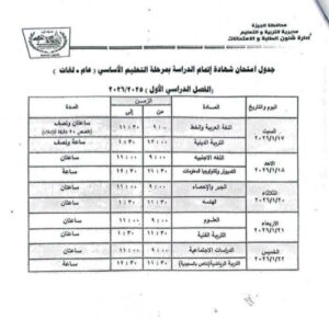 جدول الصف الثالث الإعدادي الترم الأول 2026 محافظة الجيزة